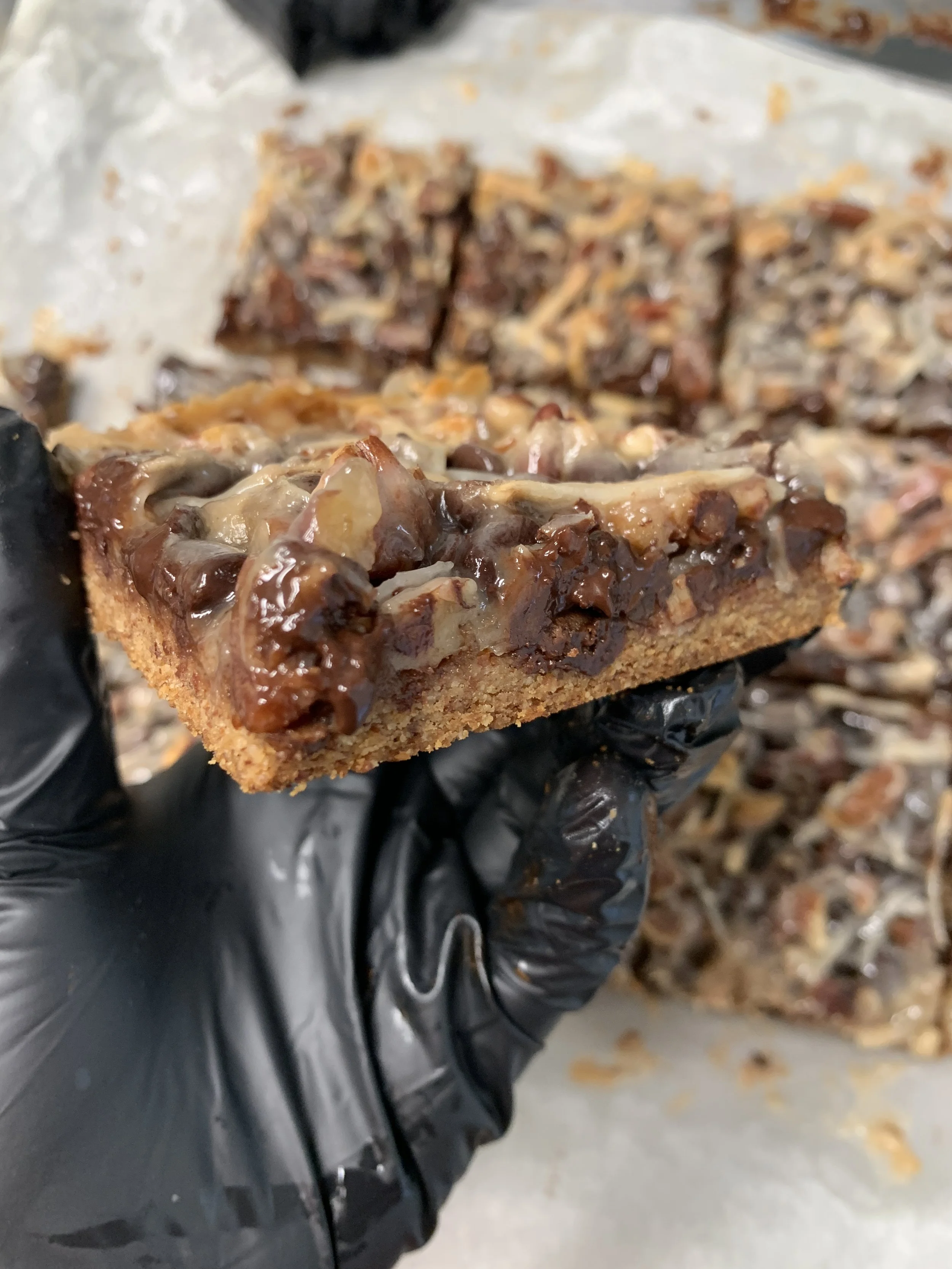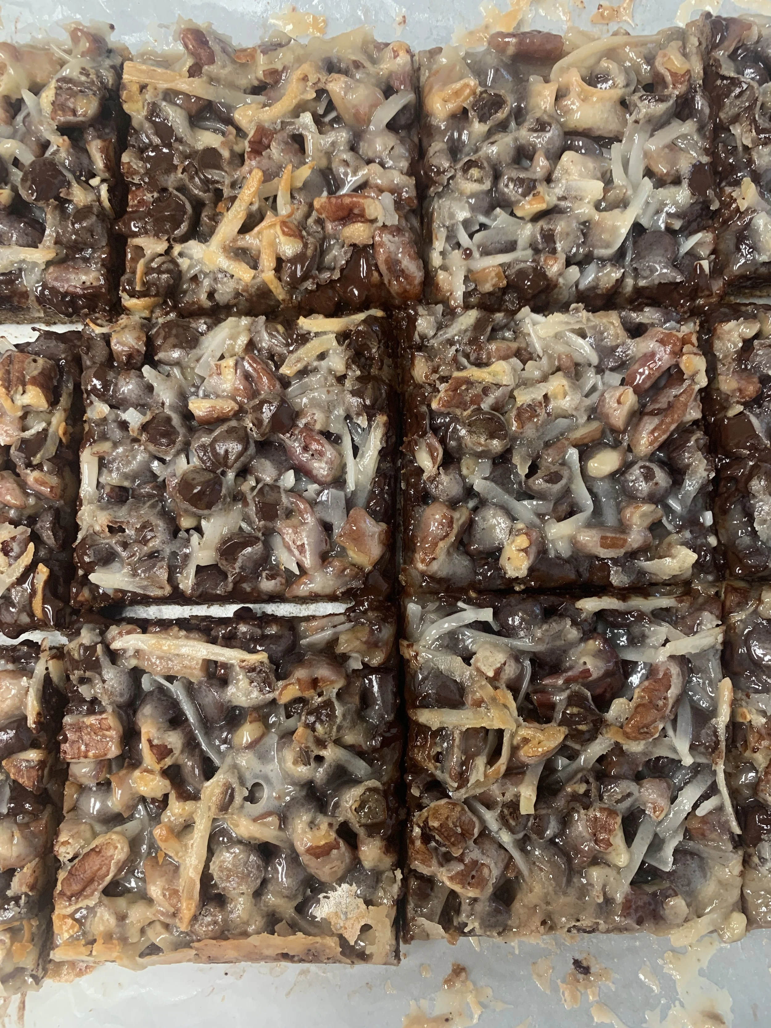 - almond flour, coconut flour, walnuts, chocolate chips, shredded coconut, condensed coconut cream, coconut oil