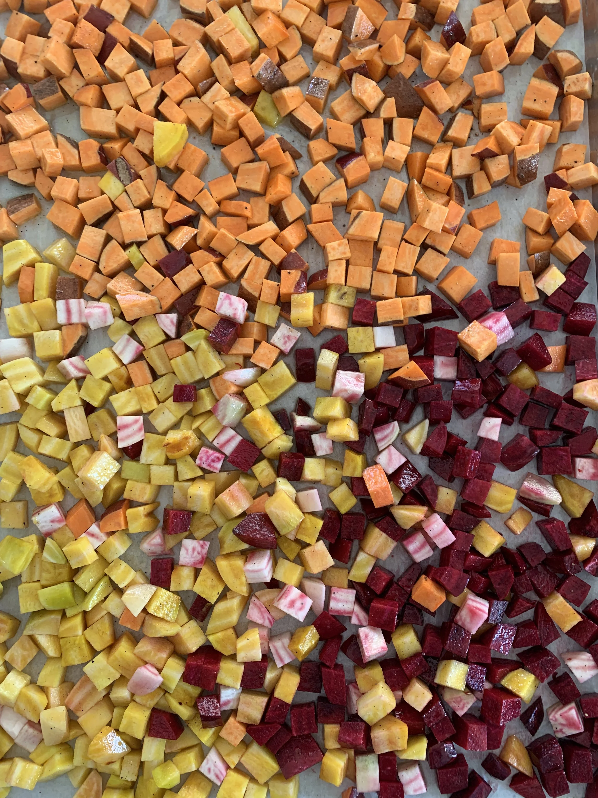 ROASTED ROOT VEG - TURNIPS, CARROTS, BEETS, SWEET POTATOES, FRESH HERBS, honey, EVOO