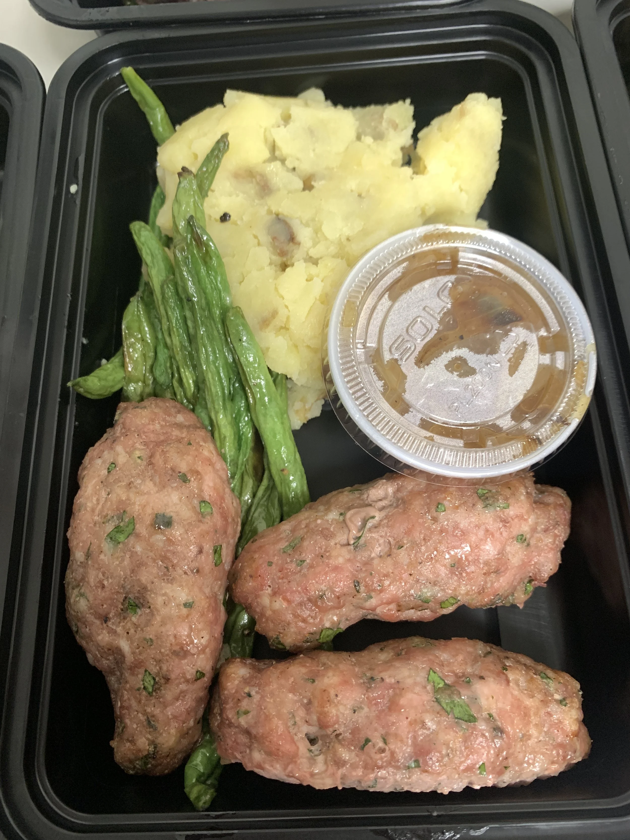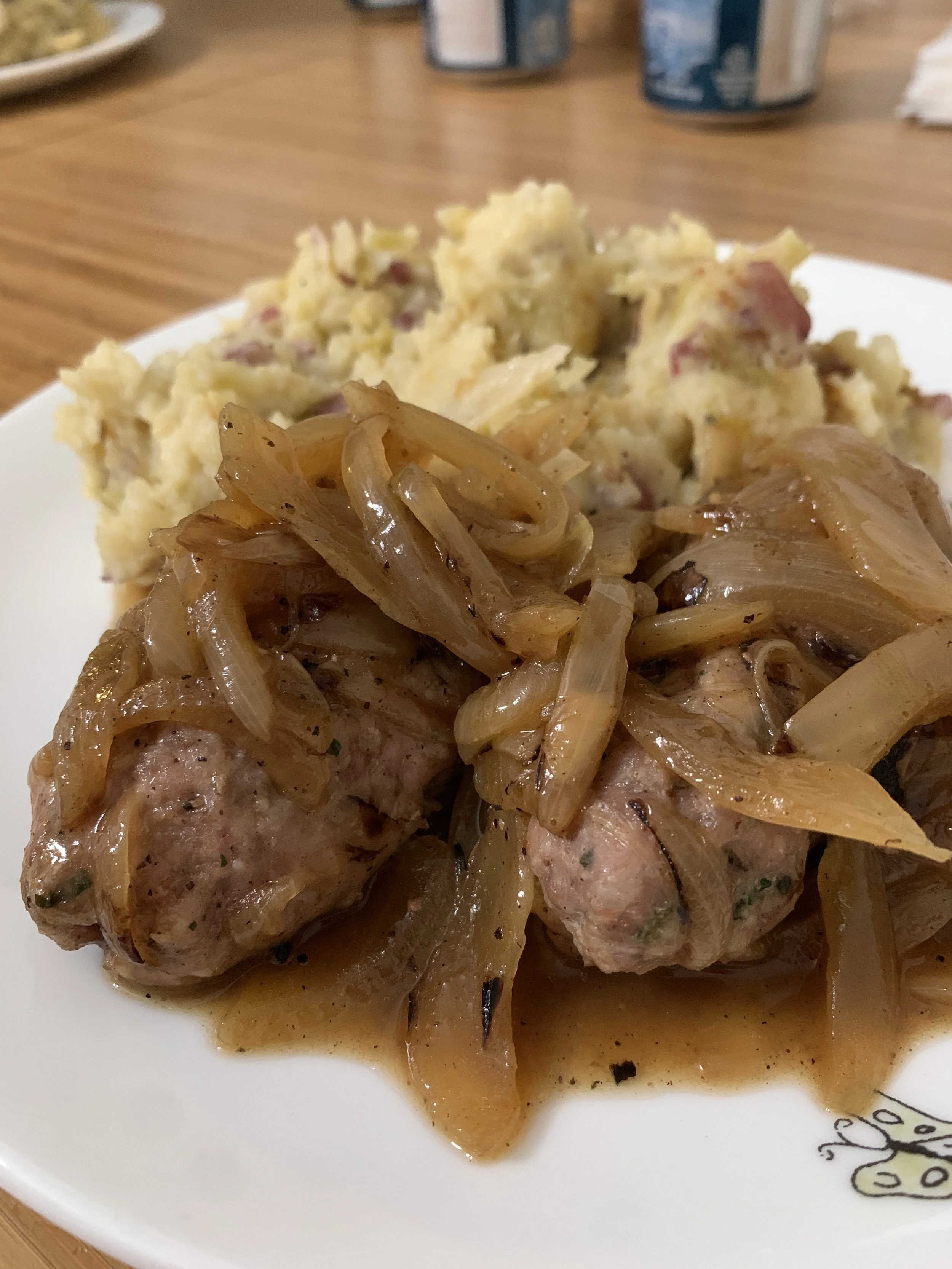 - housemade sausage patties with traditional banger spices, KM mashed potato/cauli blend, onion gravy, green beans