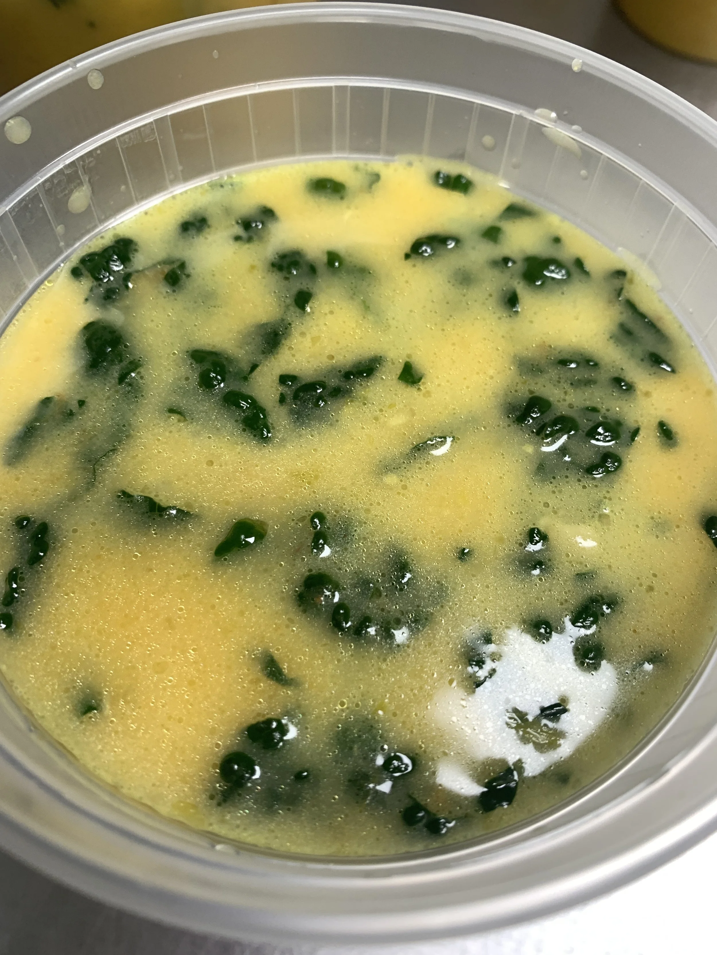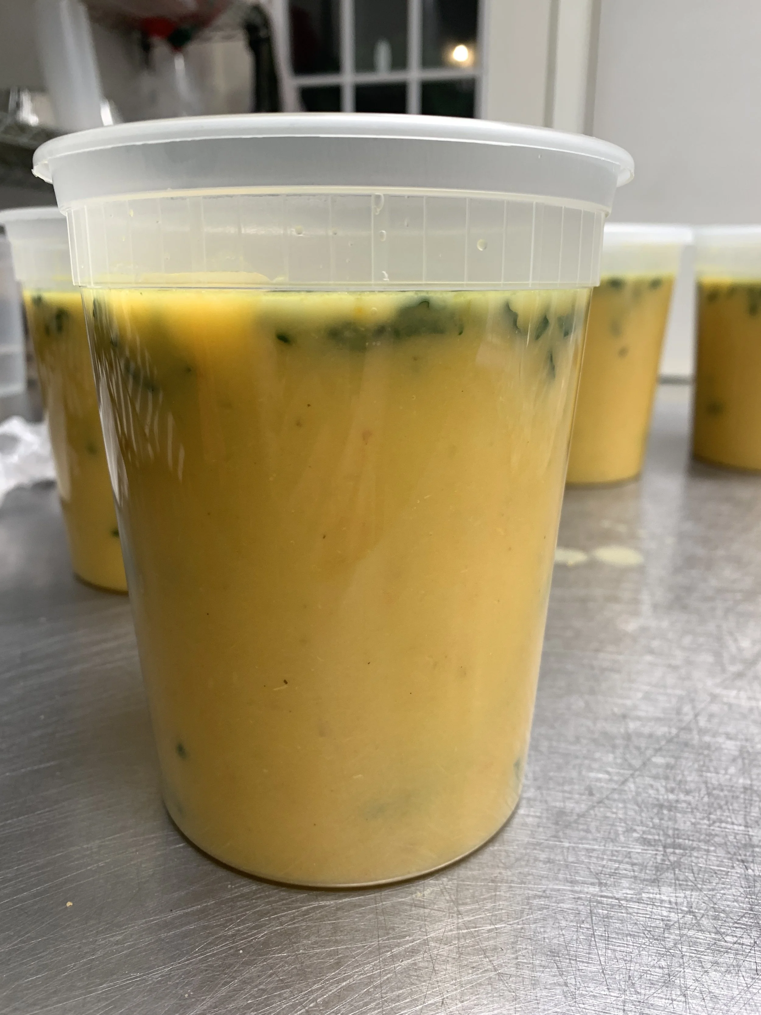 celery, onion, carrot, garlic, ginger, sweet potato, kale, coconut milk, turmeric, chicken bone broth, semi pureed