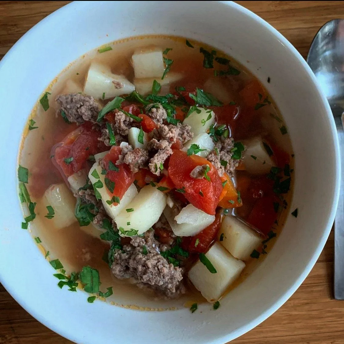 - grass fed ground beef, potatoes, carrots, celery, tomatoes, onion, garlic, parsley, chicken stock