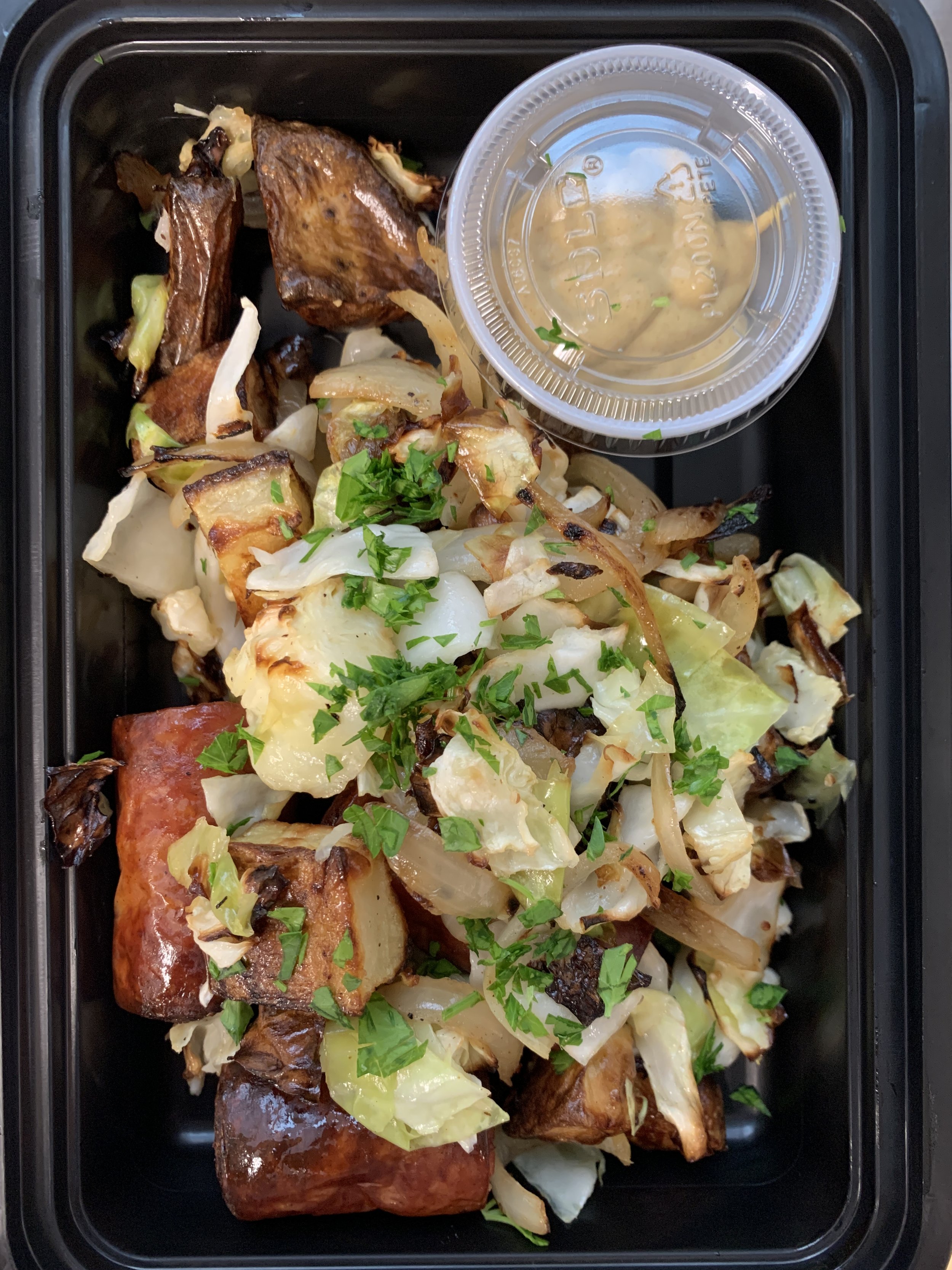 nitrate/nitrite free kielbasa, cabbage, potatoes, onions, parsley, mustard