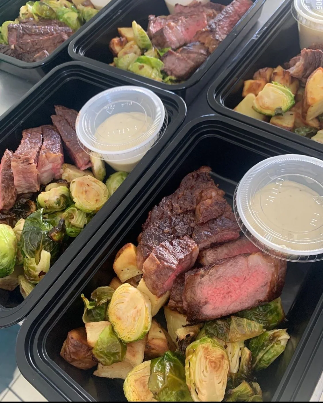 - seared sirloin, roasted potato wedges, roasted brussels creamy horseradish sauce