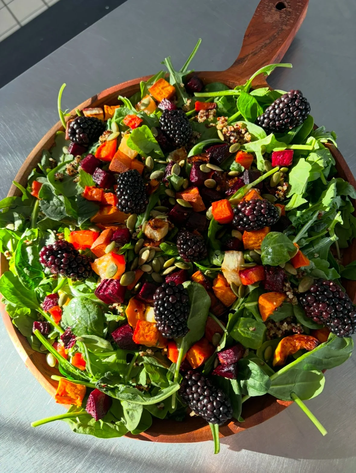 roasted beets, sweet potatoes, , roasted carrots, roasted turnips, roasted delicata squash, arugula, spinach, pumpkin seeds, blackberries, quinoa, evoo, apple cider vinegar, sea salt,