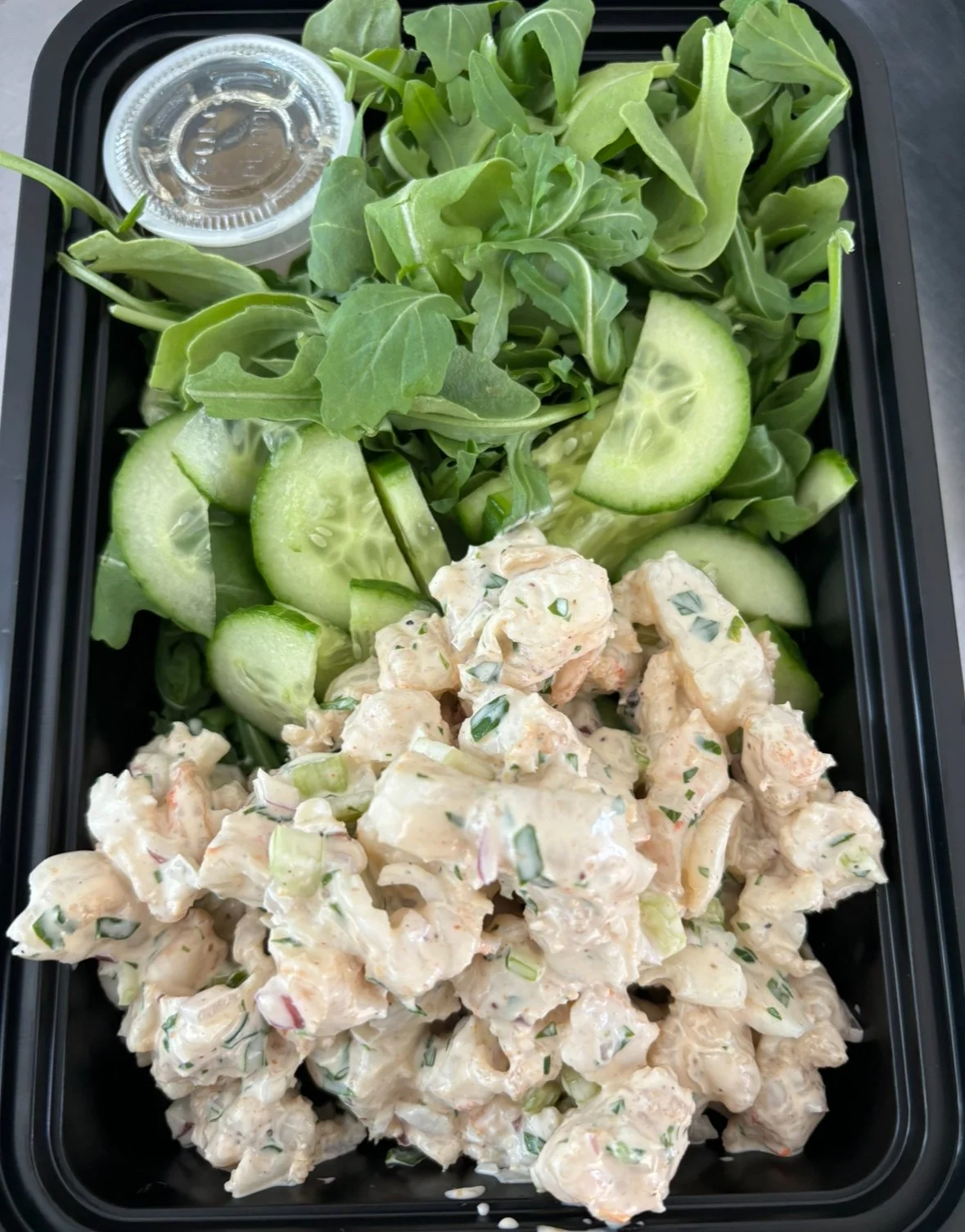 - wild shrimp tossed with celery, onions, house-made mayo, light cajun spice over greens and cucumbers with lemon vinaigrette