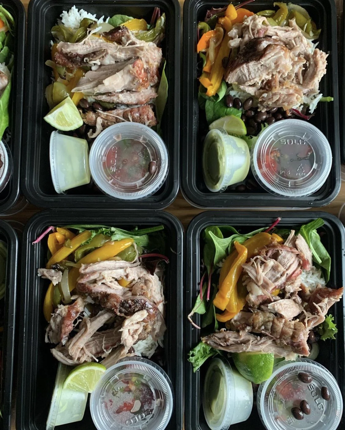 - seasoned and marinated pork butt, sautéed peppers and onions, basmati rice, spinach, roasted poblano aioli